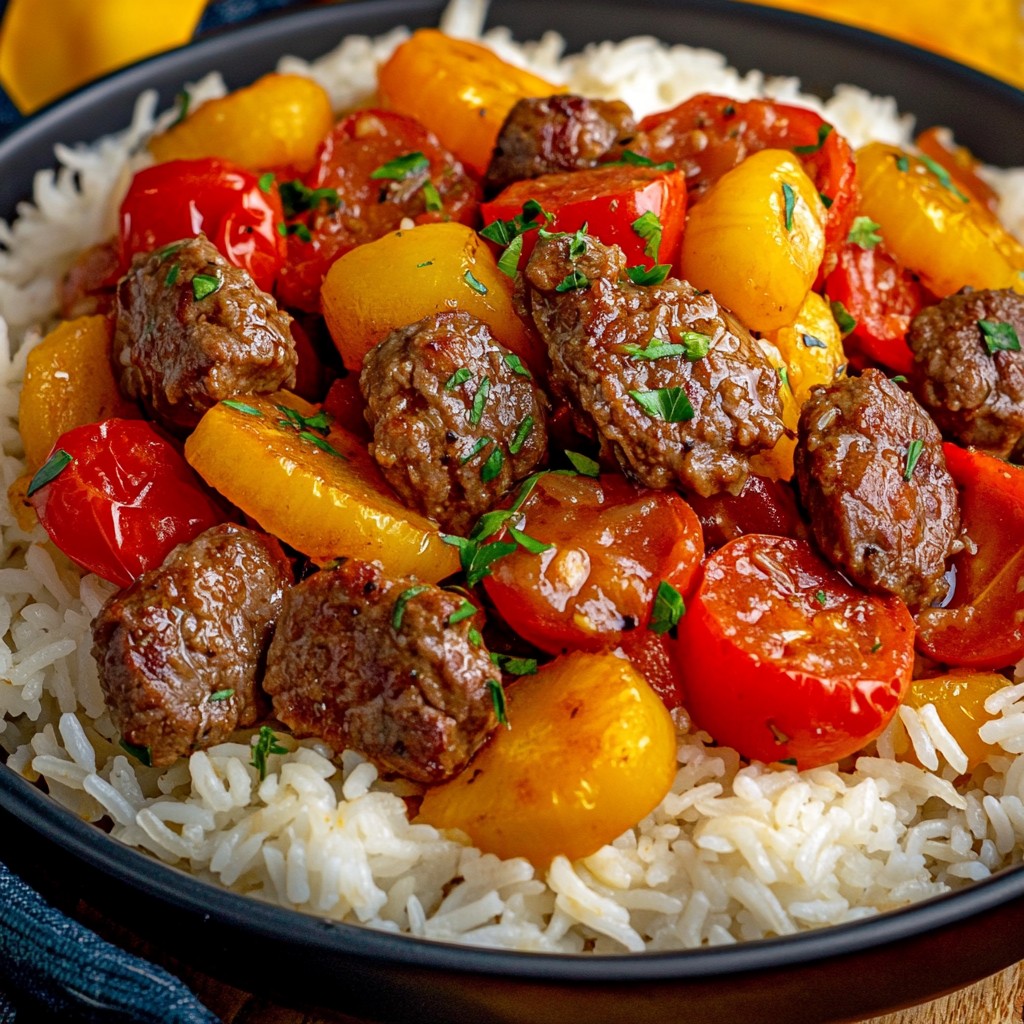 Un plat coloré, juteux et incroyablement parfumé : des boulettes dorées, des poivrons fondants, des tomates cerises caramélisées et un riz basmati léger.