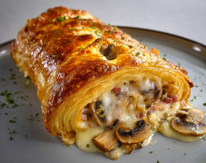 Le feuilleté champignons–jambon fait partie de ces recettes qui sentent la maison, les dimanches en famille et la bonne cuisine généreuse. Sous une pâte feuilletée dorée, bien croustillante, se cache une garniture crémeuse mêlant champignons, jambon fumé, fromage fondu et herbes fraîches.