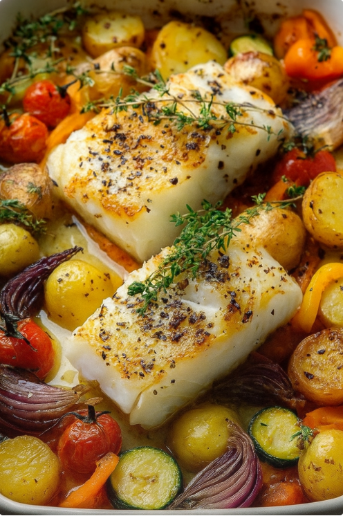 Entre la tendreté du cabillaud, la douceur des pommes de terre rôties et le parfum du citron frais, c’est un plat complet qui ensoleille la table en toute saison .