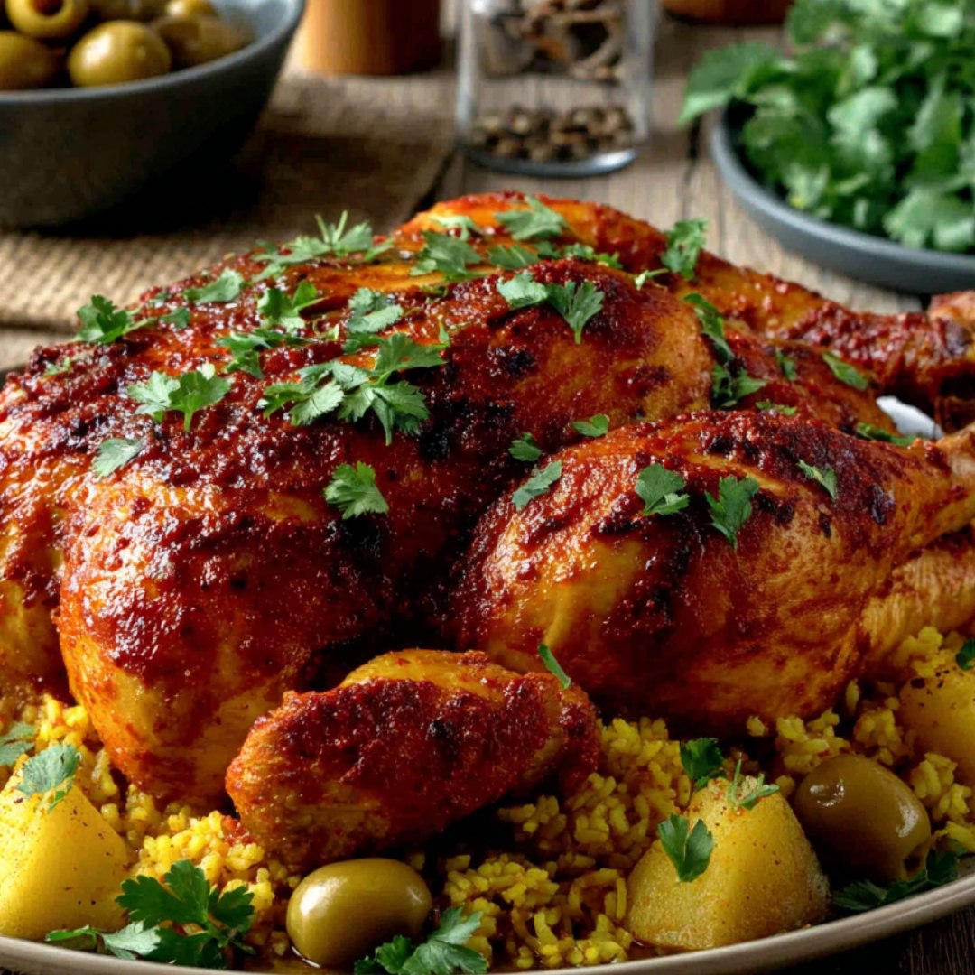 Ce poulet rôti façon marocaine se distingue par sa marinade généreuse, une peau dorée irrésistible et un goût authentique qui rappelle les bons plats maison.