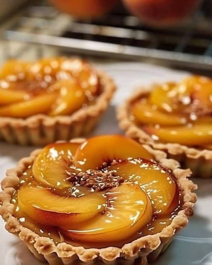 Ces tartelettes aux pêches fraîches sont le dessert estival parfait : une pâte sablée fondante, une crème vanillée onctueuse et des pêches juteuses délicatement nappées pour une finition brillante. Élégantes, fraîches et gourmandes, elles sont idéales pour un goûter chic, un dessert de famille ou une réception d’été.